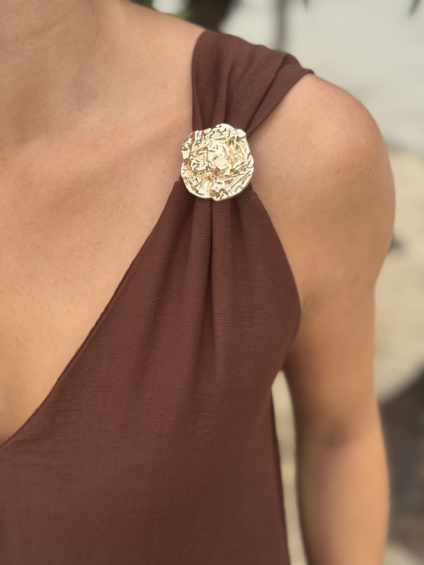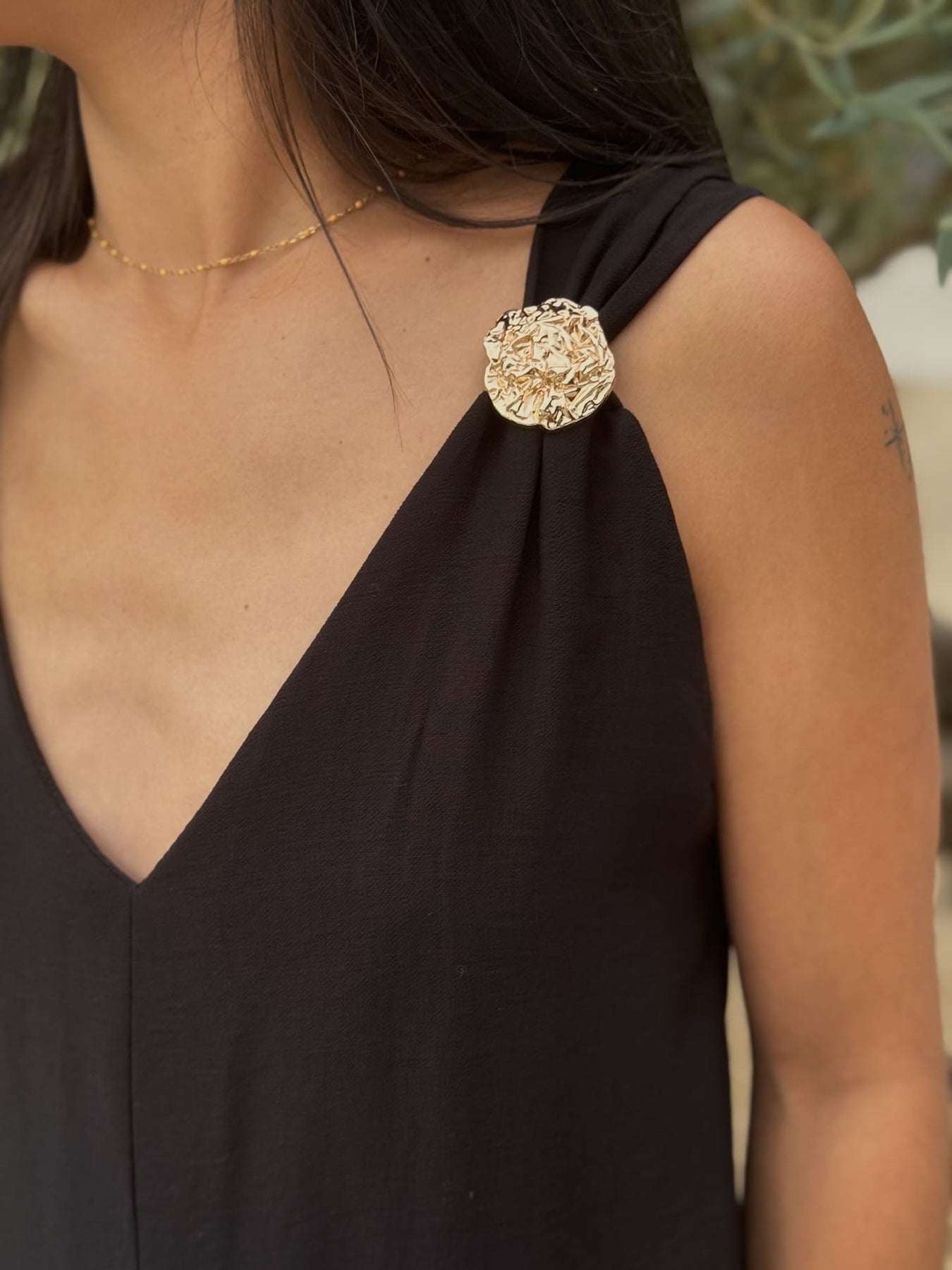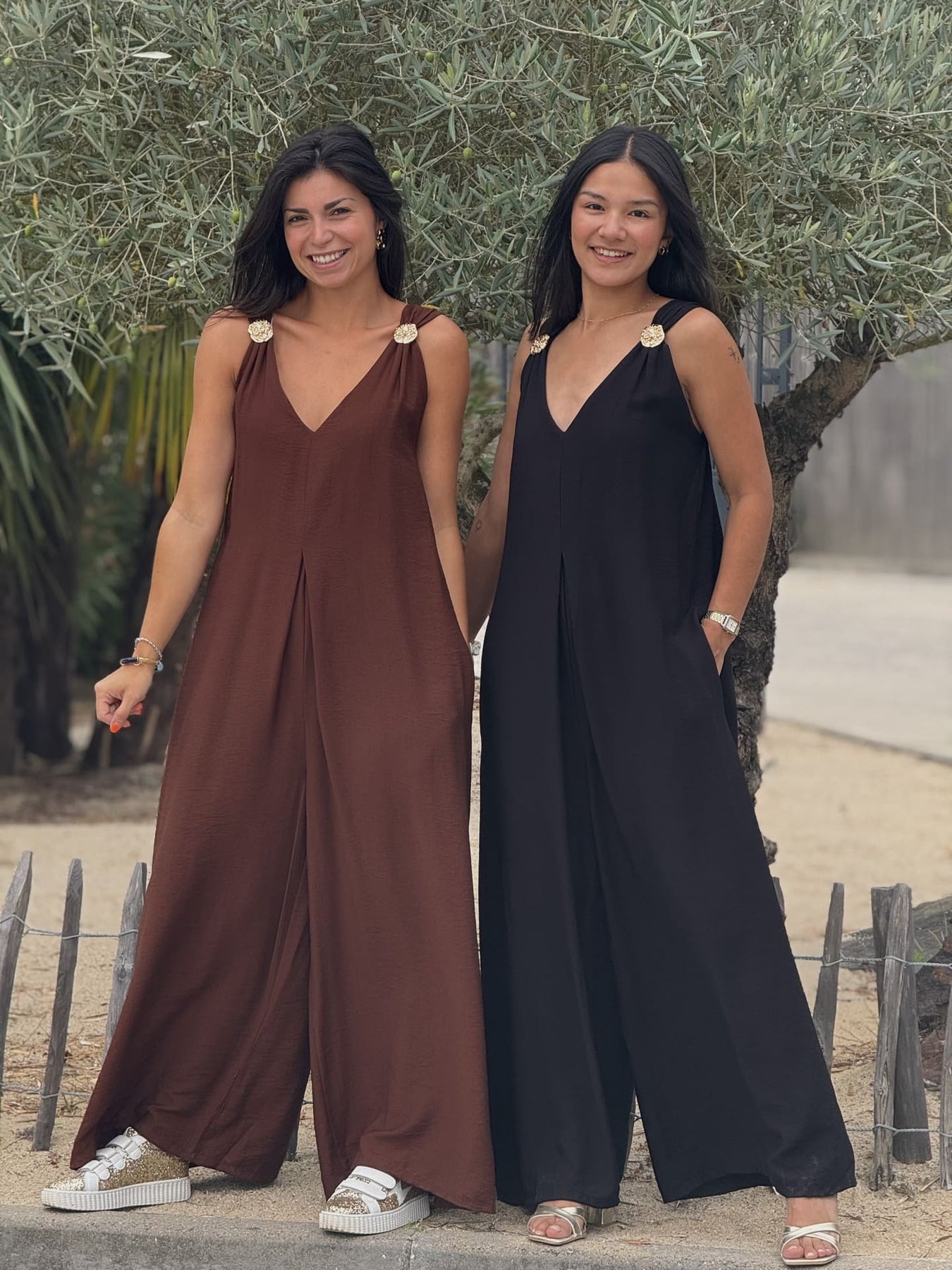 • Kombinace kalhot / sukně culotte bez rukávů s ramínky a zlatými knoflíky, výstřih do V