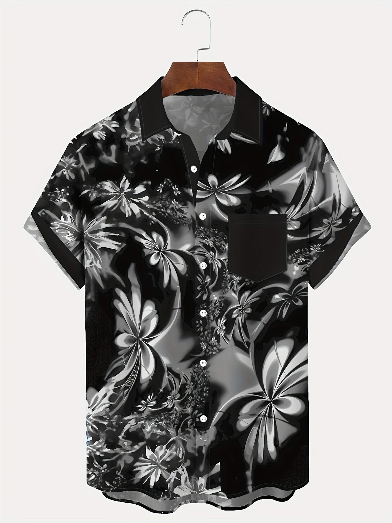 Tato pánská košile s krátkým rukávem má lesklý květinový vzor a kontrastní lemování, ideální pro toto roční období. Vyrobena z lehkých a prodyšných materiálů, vhodná na jaro a léto. Navržena s klasickým límcem, knoflíkovým zapínáním v přední části a náprsní kapsou. Volný střih ji činí ideální pro casual nebo prázdninové outfity v teplých klimatech.