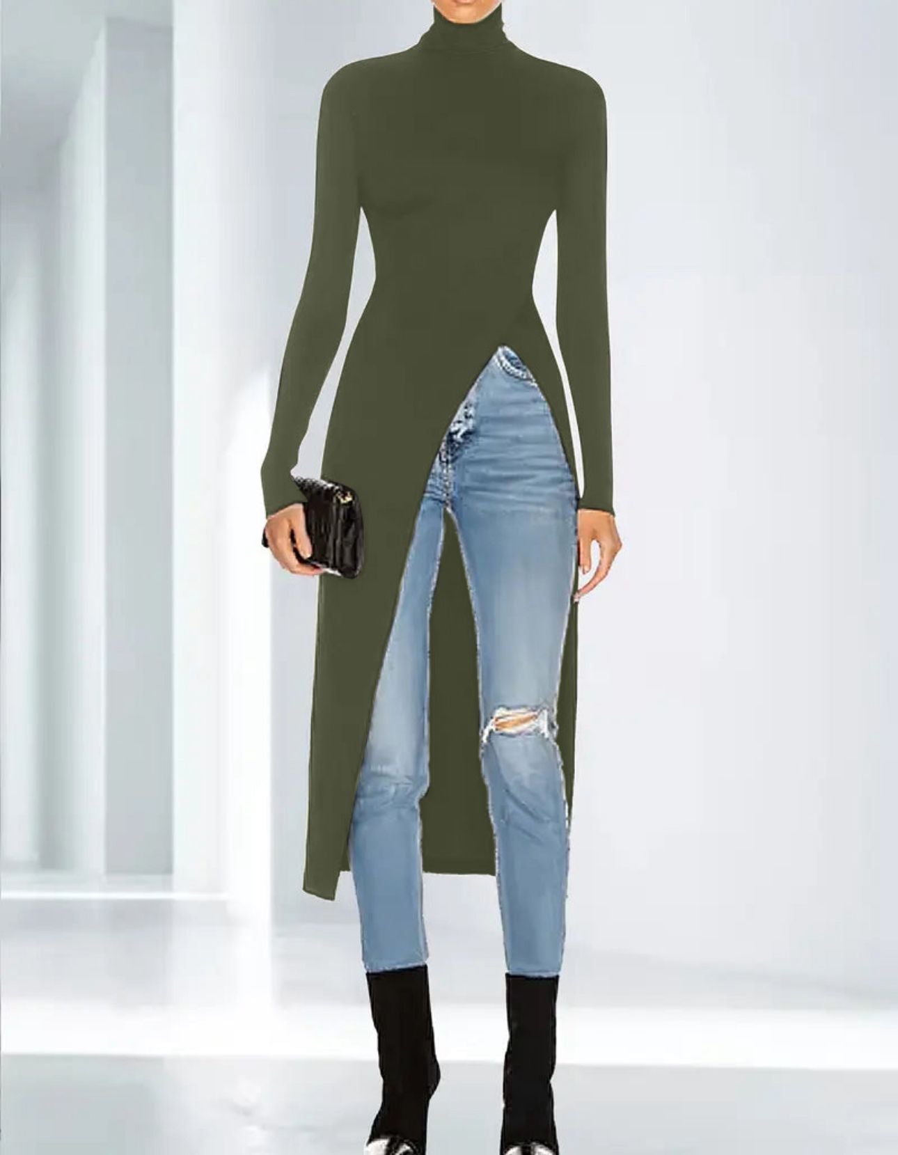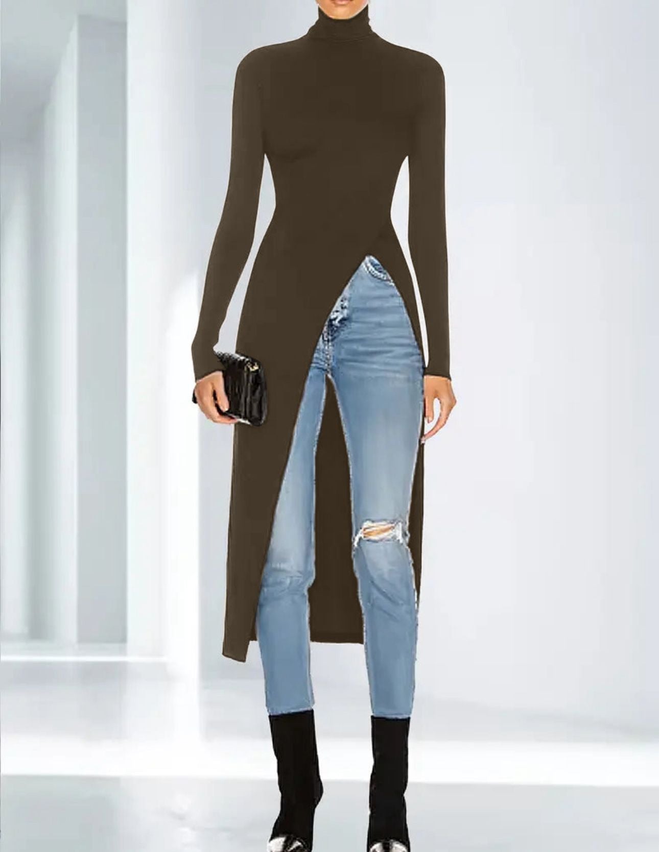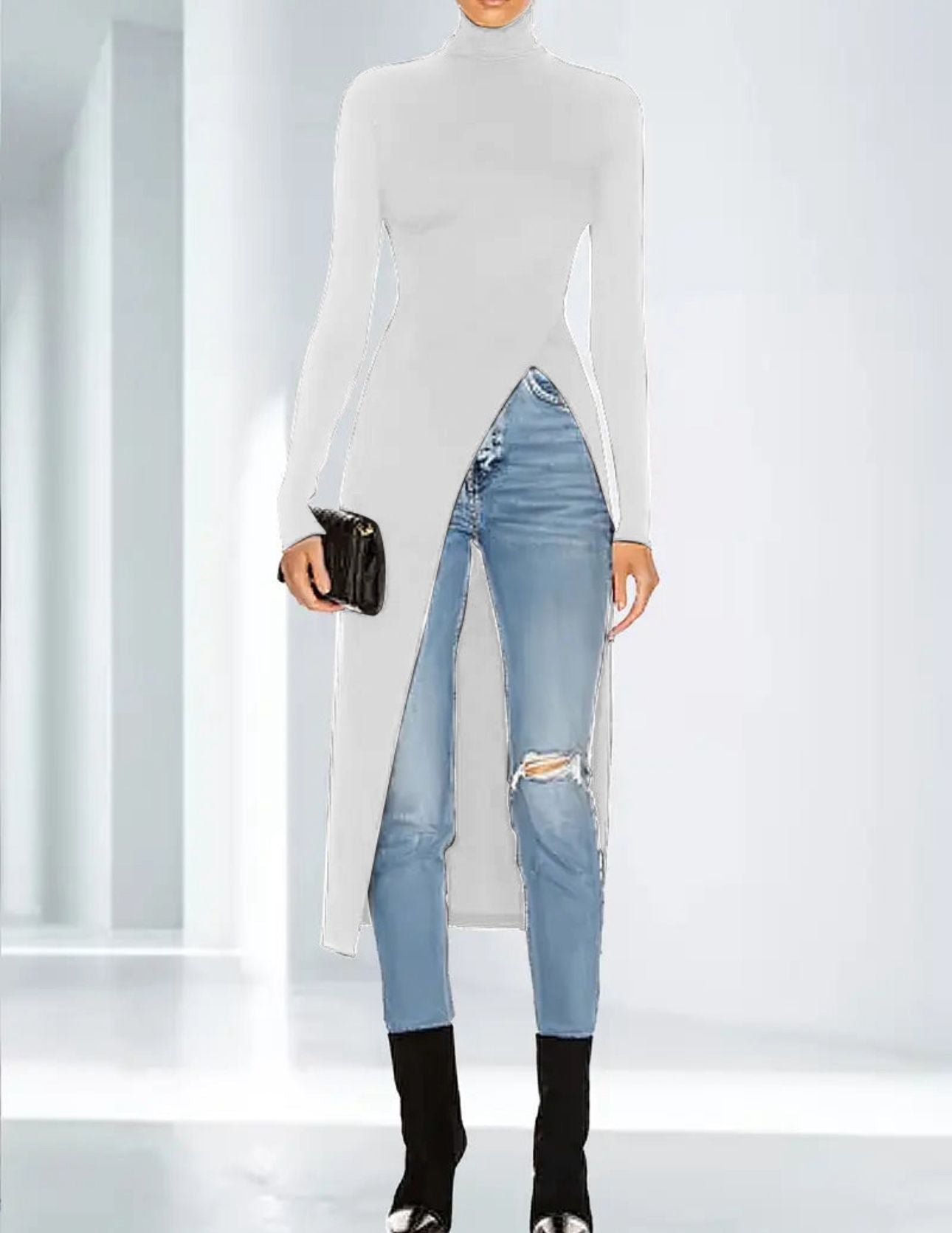 Tato dlouhá halenka s rolákem a asymetrickým předním rozparkem dodává postavě štíhlost a jedinečný šarm. Díky pružnému materiálu (95% polystretch, 5% elastan) se dokonale přizpůsobí tělu a zároveň poskytne pohodlí během celého dne.