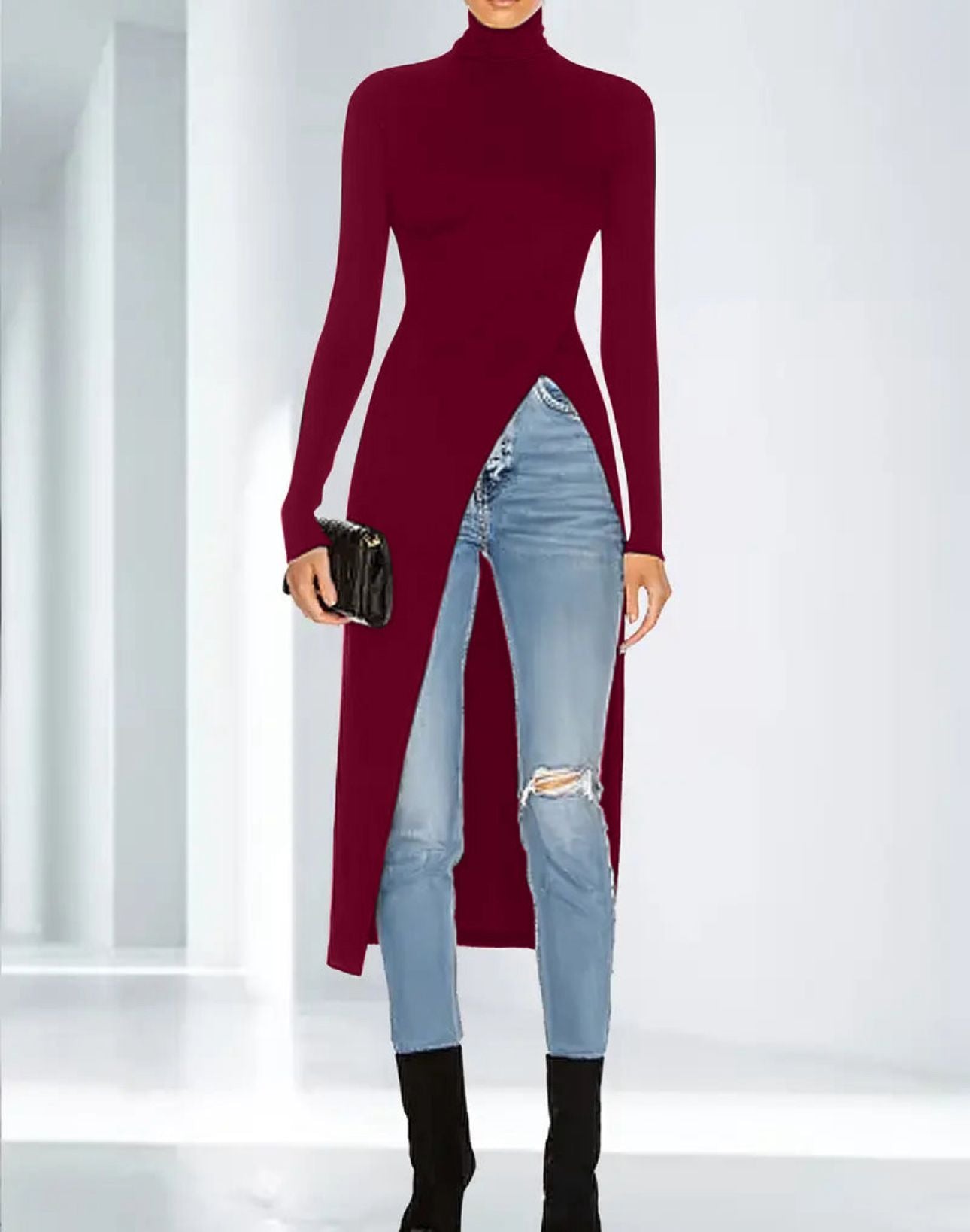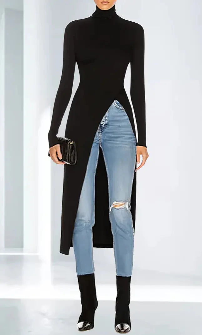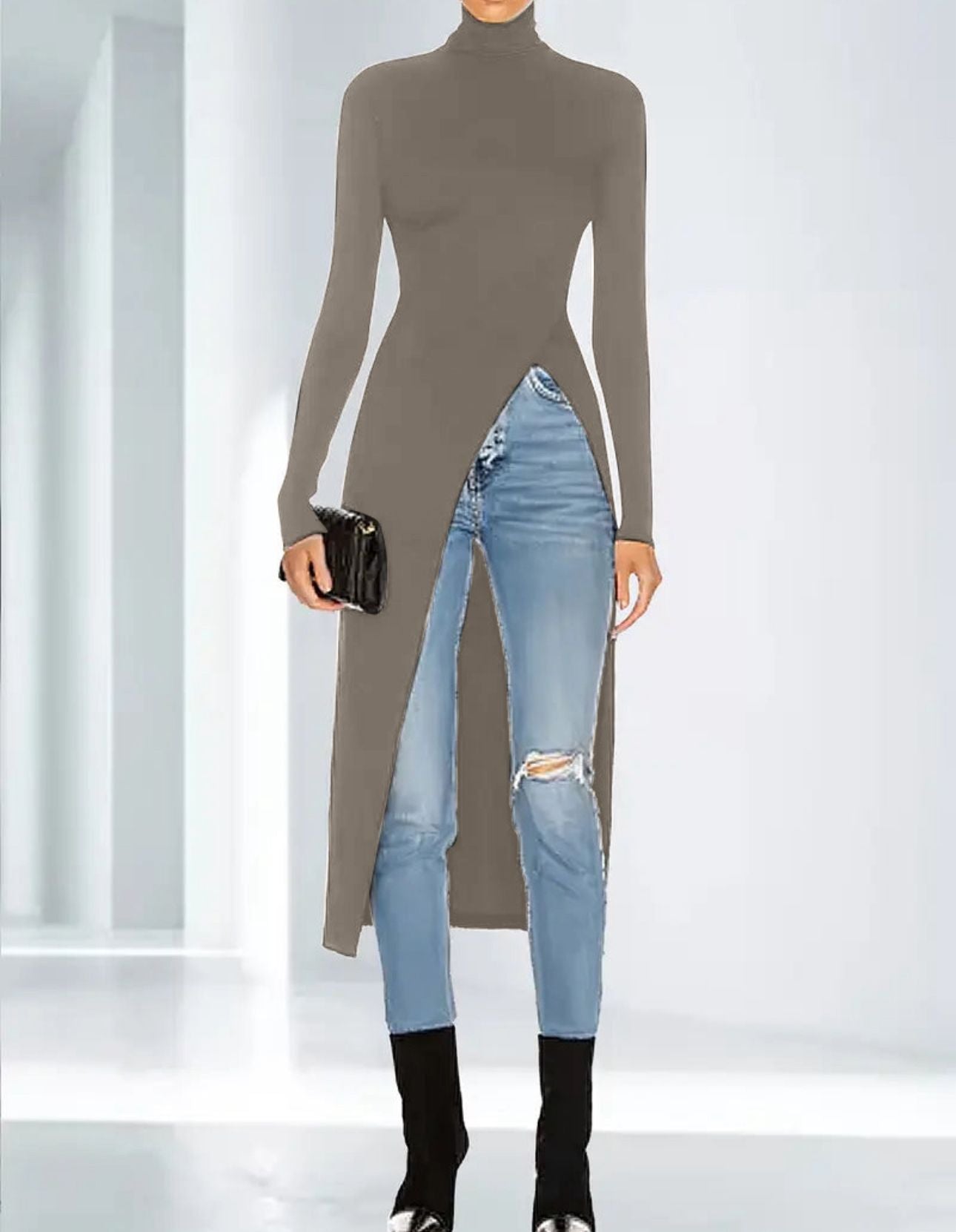 Tato dlouhá halenka s rolákem a asymetrickým předním rozparkem dodává postavě štíhlost a jedinečný šarm. Díky pružnému materiálu (95% polystretch, 5% elastan) se dokonale přizpůsobí tělu a zároveň poskytne pohodlí během celého dne.